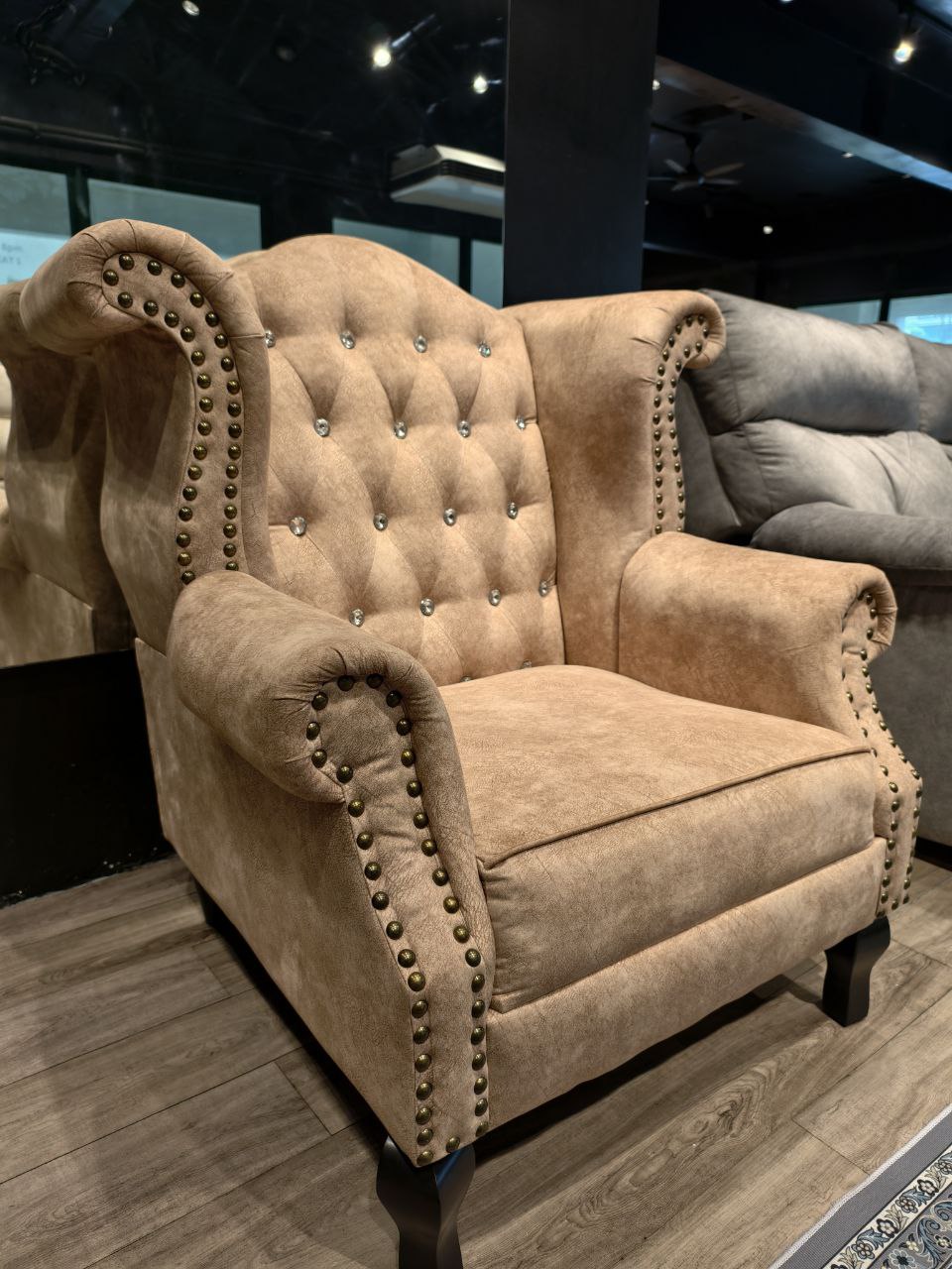 - Design: Oversized wing chair dengan authentic Chesterfield elements